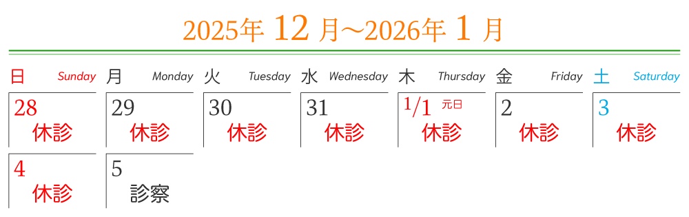 年末年始休診のお知らせ HOME お知らせ 2025年12月28日(日)から2026年1月4日(日)まで年末年始の休診とさせていただきます。 1月5日(月)から通常診療いたします。 ご不便をおかけいたしますが、よろしくお願いいたします。